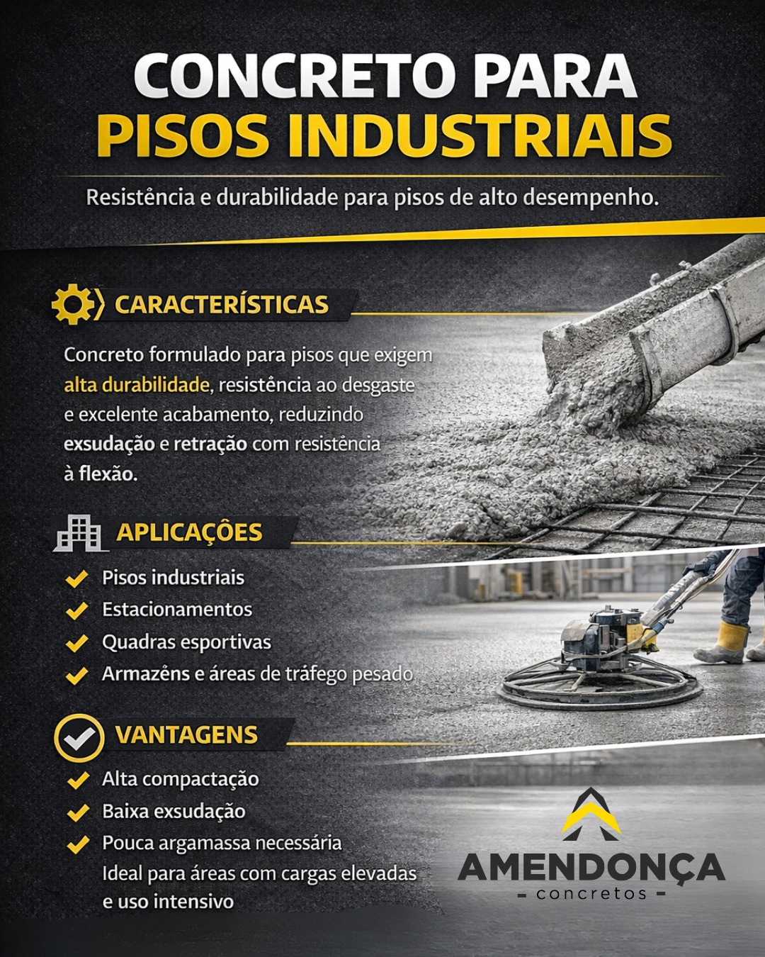 O principal requisito exigido para esse concreto é a resistência à tração na flexão e ao desgaste superficial. Na fase de execução são exigidas características como: baixa taxa de exsudação, baixa retração plástica, relação A/C reduzida. Apresenta tempo de início de pega compatível com os trabalhos de polimento dos pisos.